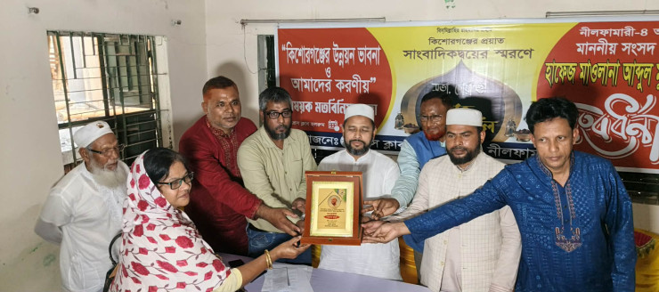 কিশোরগঞ্জ(নীলফামারী)প্রতিনিধিঃ নীলফামারীর কিশোরগঞ্জে প্রেস ক্লাবের উদ্যোগে নবনির্বাচিত সংসদ সদস্য হাফেজ আব্দুল মুনতাকিমকে সংবর্ধনা প্রদান করা হয়েছে। প্রেস ক্লাব হলরুমে বৃহস্পতিবার সন্ধ্যায় এ সংবর্ধনা প্রদান করা হয়। এর আগে প্রেস ক্লাব হলরুমে “কিশোরগঞ্জের উন্নয়নে ভাবনা ও আমাদের করণীয়” শীর্ষক সভা অনুষ্ঠিত হয়েছে। একই অনুষ্ঠানে প্রয়াত সাংবাদিকদ্বয়ের স্মরণে সভা, দোয়া, ইফতার মাহফিল হয়। এতে প্রধান অতিথি ছিলেন নীলফামারী-৪ আসনের সাংসদ হাফেজ মাওলানা আব্দুল মুনতাকিম। প্রেস ক্লাব সভাপতি আবু হাসান শেখ’র সভাপতিত্বে ও সাধারণ সম্পাদক শামীম হোসেন বাবু’র সঞ্চালনায় অনুষ্ঠানসমূহ হয়। এতে বক্তব্য রাখেন প্রেস ক্লাবের প্রতিষ্ঠাতাকালীন সভাপতি ও দিনকালের জেলা প্রতিনিধি ফজল কাদির, কিশোরগঞ্জ সদর ইউপি চেয়ারম্যান হোসেন শহিদ সোহরাওয়াদর্ী গ্রেনেট বাবু, মাগুড়া ইউপি চেয়ারম্যান আখতারুজ্জামান মিঠু, বাংলাদেশ জামায়াতে ইসলামীর উপজেলা সহকারী সেক্রেটারী শিব্বির আহমেদ, খেলাফত মজলিসের উপজেলা শাখার সাধারণ সম্পাদক হাফেজ শরিফুল ইসলাম, নীলফামারী জেলা গণঅধিকার পরিষদের সাংগঠনিক সম্পাদক রাকিব হোসেন, শিক্ষক দেলোয়ার হোসেন, শিক্ষক আবুল কাসেম প্রমুখ। এছাড়া বিভিন্ন কর্মকর্তা, সাংবাদিক, সমাজসেবক, সামাজিক সংগঠনের নেতৃবৃন্দ, সাংবাদিকগণ উপস্থিত ছিলেন। প্রেস ক্লাবের পক্ষে নবনির্বাচিত সংসদ সদস্য হাফেজ মাওলানা আব্দুল মুনতাকিমের হাতে সংবর্ধনার ক্রেষ্ট তুলে দেয়া হয়। এসময় প্রয়াত বরেণ্য সাংবাদিক আলম হোসেন ও এস এস এম বাসুর পরিবারকে মরণোত্তর সম্মাননা ক্রেষ্ট ও প্রাইজ মানি দেয়া হয়।